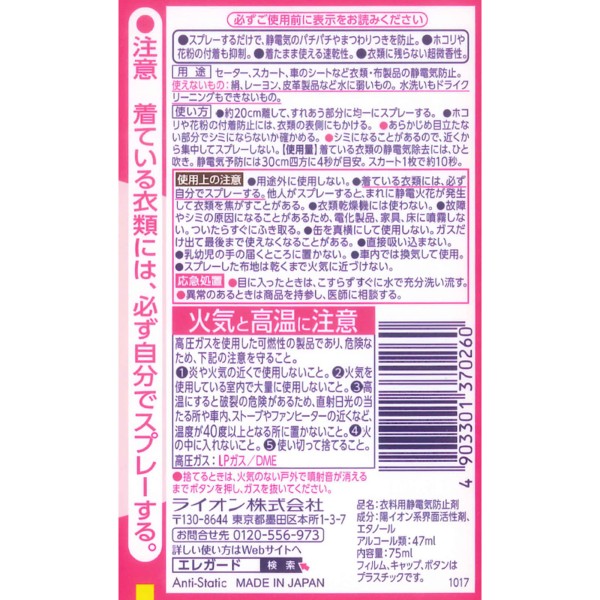 엘레가도 정전기 방지 스프레이 소 75ml 라이온 > 정전기 방지제·의류용 방수 스프레이
