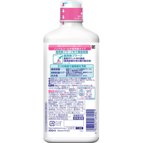 시스테마 EX 덴탈 린스 논알코올 구강세정제 450ml 라이온 > 치주병 예방