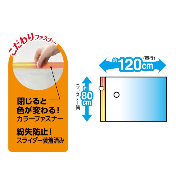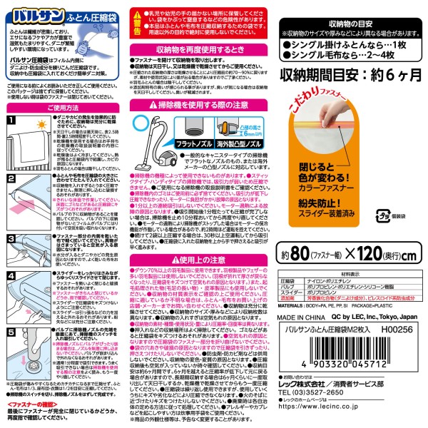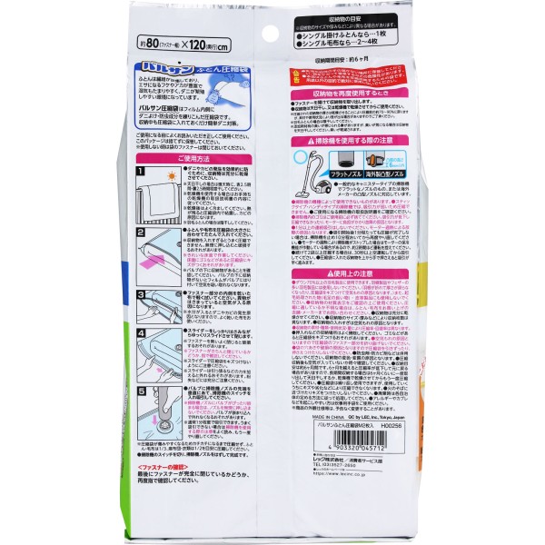 防虫・殺虫でおなじみ「効き目のバルサン」シリーズから圧縮袋が登場。ダニよけ成分に加えて防虫成分も配合。ダニだけではなく、イガ・カツオブシムシなどの害虫からも布団を守ります。アレルギーの原因ともなるダニはもちろん、大切な布団の繊維を食べてしまう害虫にも効果があります。ダニよけ・防虫成分は圧縮袋の内側に練り込んでいるので、外に漏れず内側だけに徐々に蒸散していきます。海外製凸型ノズルにも対応したオートバルブで、スピード吸引を実現しています。閉じると色が変わるカラーファスナーを採用。閉じ忘れを防ぎます。ファスナーを閉めるスライダーは取り付け済みなので、紛失もしづらいです。2つ折りも対応できるタテ型タイプです。狭い場所への収納にも便利です。※収納物の目安、シングル掛け布団なら1枚、シングル毛布なら2~4枚
