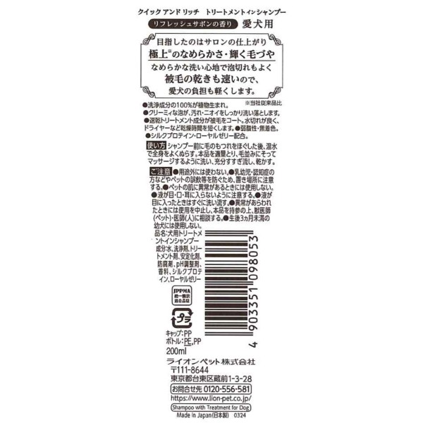 퀵&리치 트리트먼트인 샴푸 애완견용 리프레쉬 사봉 200ml 라이온상사 > 개용 샴푸류