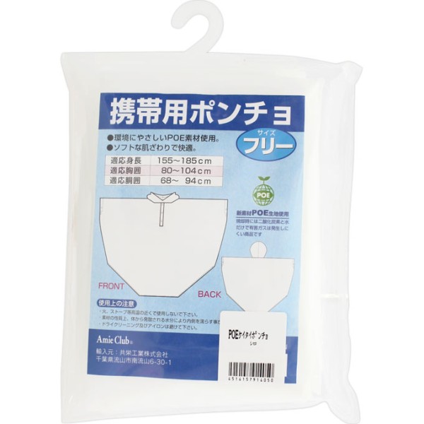 POE携帯用ポンチョです。雨の時自転車に乗り傘をさすして片手で運転するのは違法です。ポンチョですので頭から羽織り切れますので便利です。生地はEVA乳白色です。