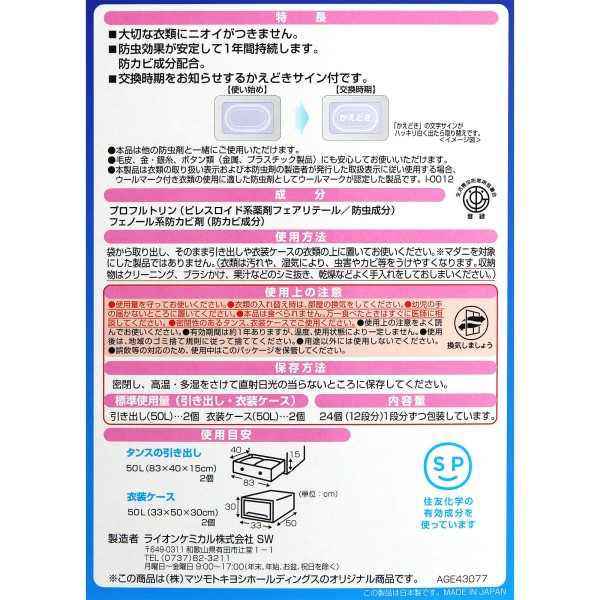 MK 냄새안나는 방충제 1년방충 서랍용 24개입 라이온케미컬 > 무향 1년용