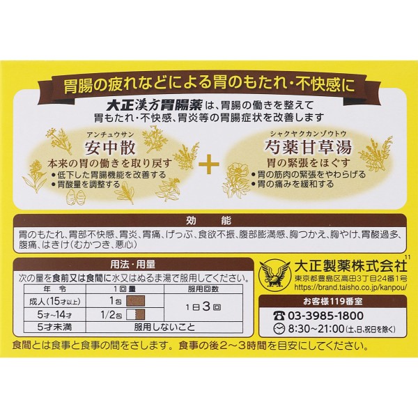 安中散と芍薬甘草湯の組み合わせにより、ふだんから胃腸が弱く、不規則な食生活や夏バテなどで胃腸が不調である、食欲が出ない、といった人に適した胃腸薬です。