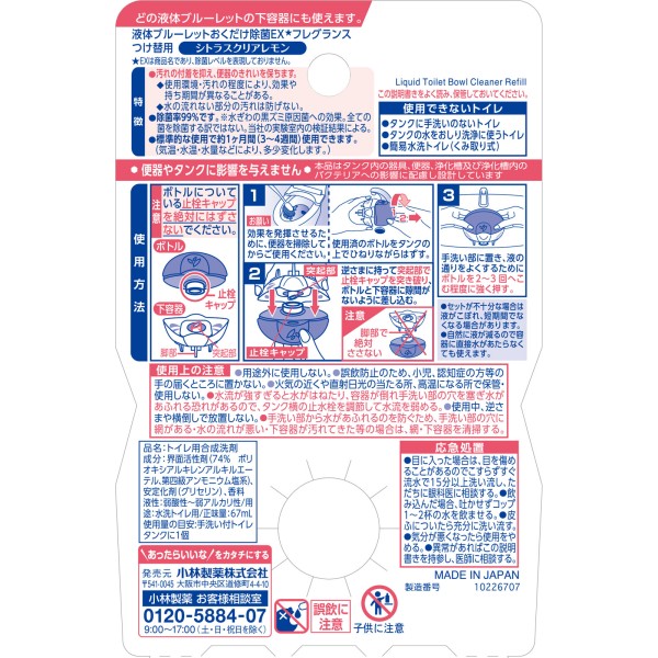 액체 블루렛 내려놓기만 살균 EX 프래그런스 교체품 시트러스 클리어 레몬 67ml 고바야시제약 > 변기 탱크용 액체