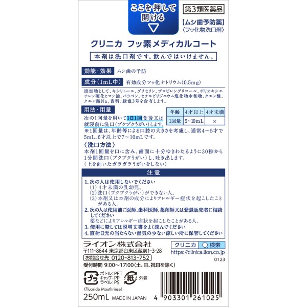 클리니카 불소 메디컬 코트 250ml 라이온 > 충치 예방 의약품