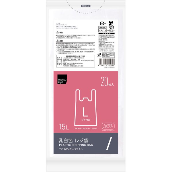 CO2排出20%OFF。レジ袋としてはもちろんごみの分別など便利に使える乳白色レジ袋。