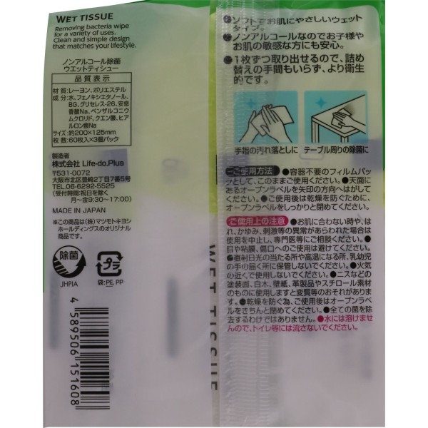 마츠키요 논알코올 살균 웨트 티슈 60매 3P > 제균