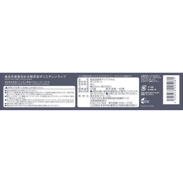 電子レンジ対応耐熱温度110度&フリーザー対応耐冷温度マイナス60度で添加物を使用していない環境にやさしいラップです。