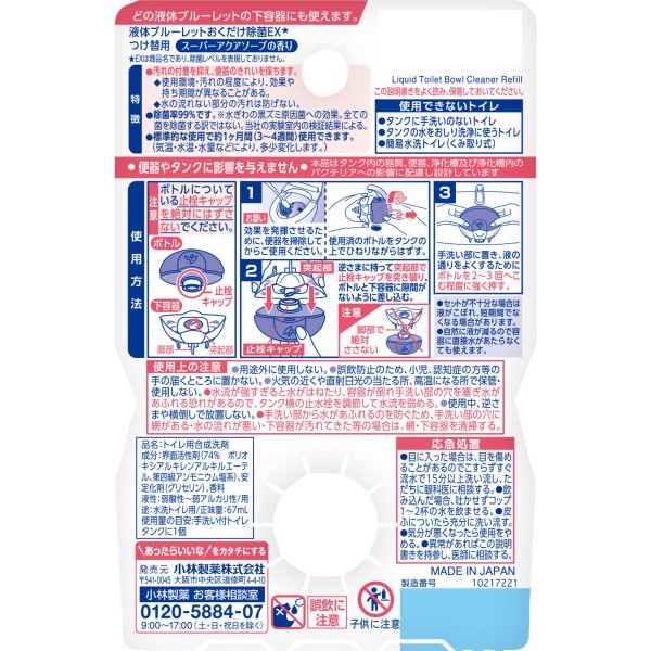 액체 블루렛 내려놓기만 살균 EX 교체품 슈퍼 아쿠아 소프 향 67ml 고바야시제약 > 변기 탱크용 액체