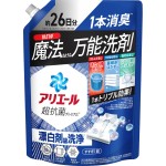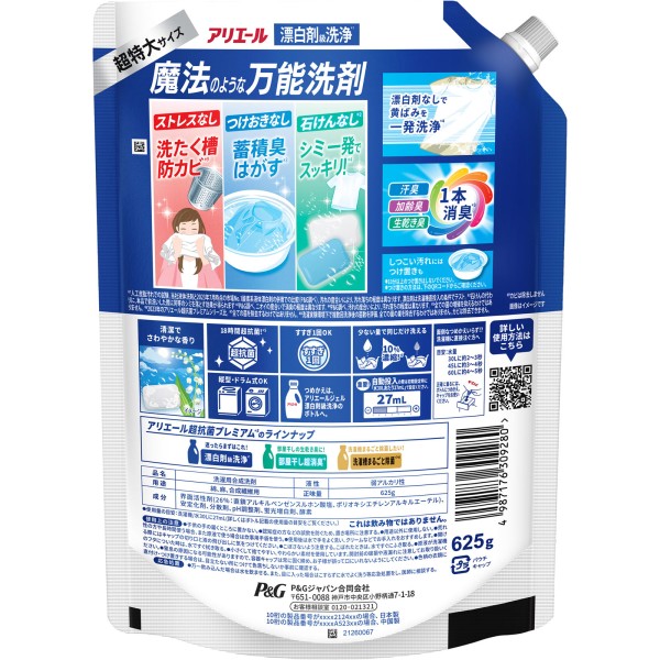 NEW 魔法のような万能洗剤 1本トリプル効果。。ストレスなし 洗たく槽防カビ*1つけおきなし 蓄積臭はがす*2石けんなし*3 シミ一発でスッキリ。*4漂白剤なしで黄ばみを一発洗浄*4汗臭 加齢臭 生乾き臭 1本消臭*218時間超抗菌。*510パーセント濃縮。*6 少ない量で同じだけ洗える*1 カビは除去しません *3 石けんの代わりに、本品で前洗いした際に同等のシミを落とす効果が得られます *2 PG調べ。ニオイの度合いで消臭の程度は異なります。 *4 PG調べ。汚れの度合いにより、汚れ落ちの程度は異なります。 *5 全ての菌の増殖を抑えるわけではありません。 *6 2023年のアリエール超抗菌プレミアムシリーズ比。