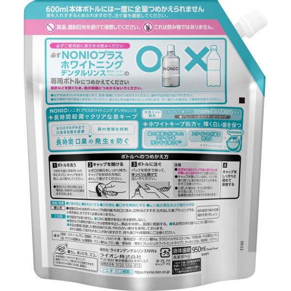 NONIO(노니오) 구강세정제 플러스 화이트닝 리필 파우치 구강세정제 950ml 라이온 > 구취 예방