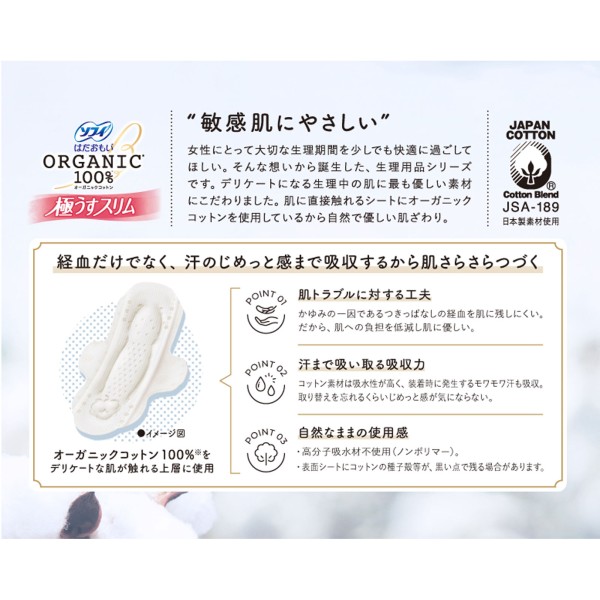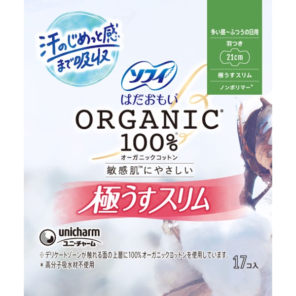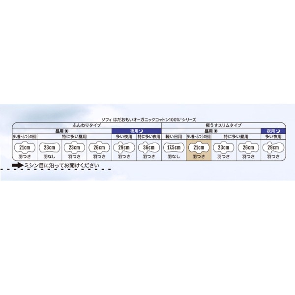 소피 하다오모이 오가닉 코튼 극박 슬림 많은 낮 보통의 날용 날개 포함 21cm 17매 유니참 > 하다오모이 오가닉