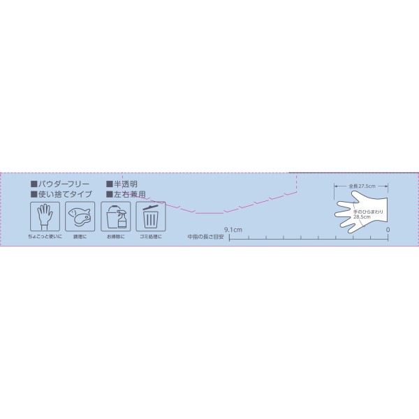 ポリエチレン製使いきり手袋。ワイドな形状で、着脱がスムーズです。簡易的な作業に適しています。