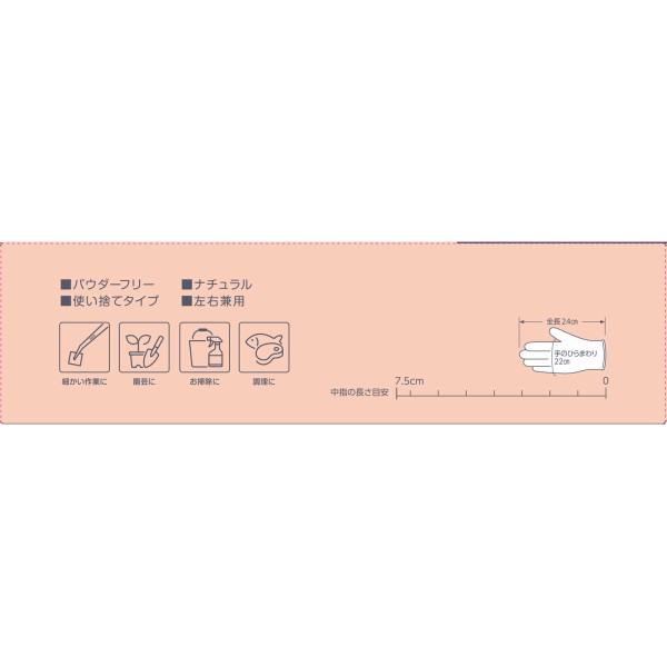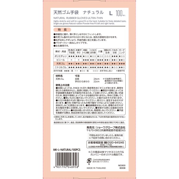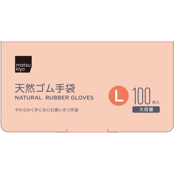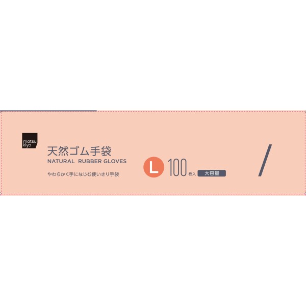 天然ゴム製使いきり手袋100枚入Lサイズ。伸縮性に優れ、やわらかく手になじみます。