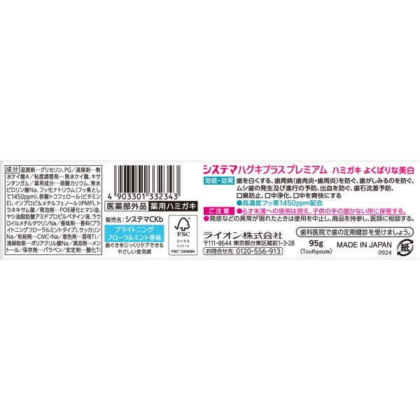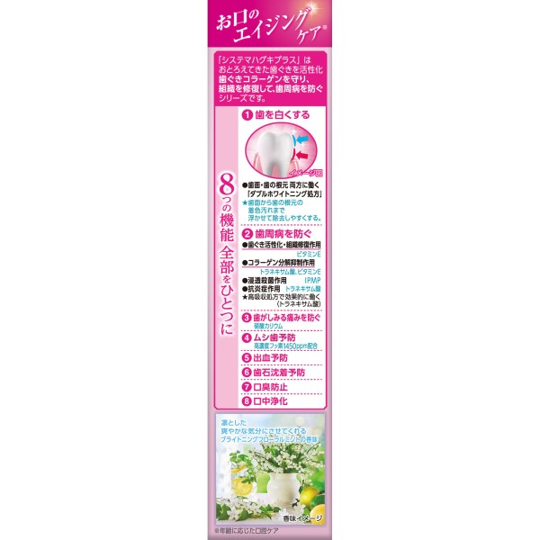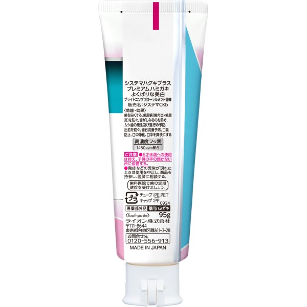 시스테마 하구키 플러스 프리미엄 치약 욕심쟁이 미백 브라이트닝 플로럴 민트 치약 95g 라이온 > 치주병
