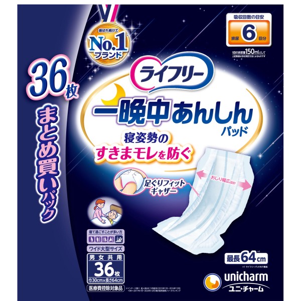 라이프리 테이프형 전용 소변 흡수패드 밤새 안심 패드 6회 흡수 성인용 기저귀 36매 유니참