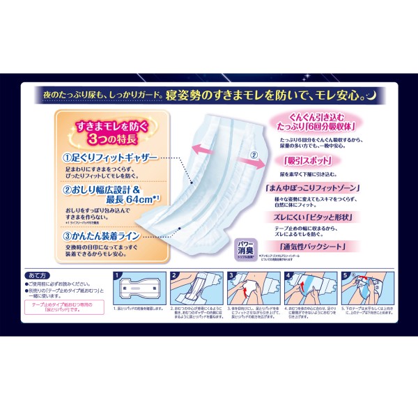 足ぐりフィットギャザーとおしり幅広設計で寝姿勢でもモレずに一晩中安心できる尿とりパッドです。