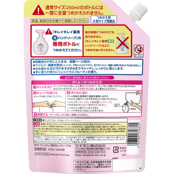 키레이키레이 거품 핸드소프 시트러스 프루티 리필 대형 5% 증량 475ml 라이온 > 키레이키레이 거품 타입
