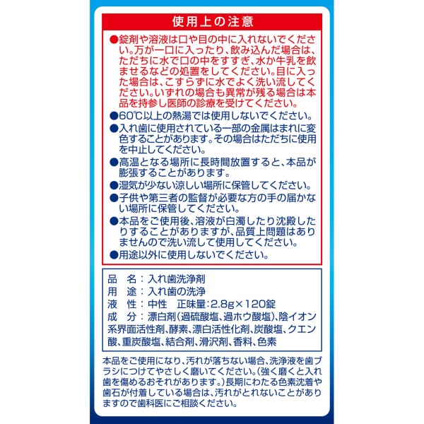 除菌率99.9%の強力除菌、酵素配合でしっかり洗浄し漂白洗浄成分が入れ歯のニオイを消臭します。