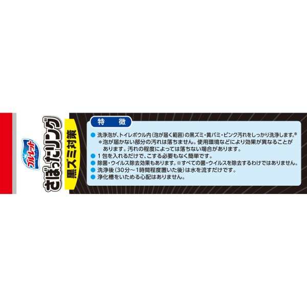 ●黒ズミ対策洗浄成分が便器の水たまりの上まで強力に発泡し、水ぎわの黒ズミ・黄バミをしっかり落とす。