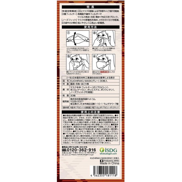 KUCHIRAKU 마스크 그레이 개별 포장 30매입 의식동원닷컴 > 특수 마스크