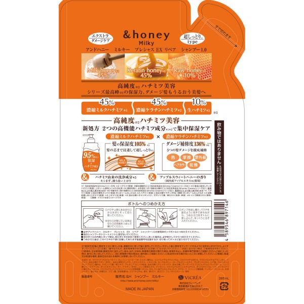 앤드허니 밀키 프레셔스 EX 리페어 샴푸 1.0 리필 385mL 빅클리어 > 앤드허니