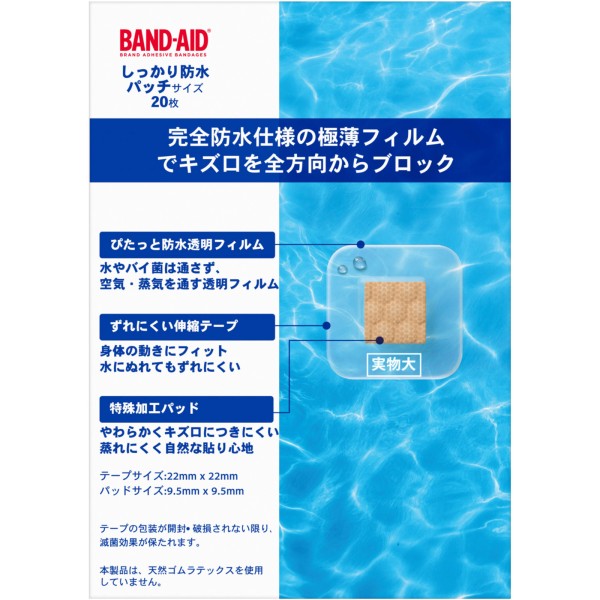 「バンドエイド しっかり防水」は、完全防水仕様の極薄透明フィルムでキズ口を全方向からブロックする救急ばんそうこうです。