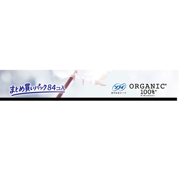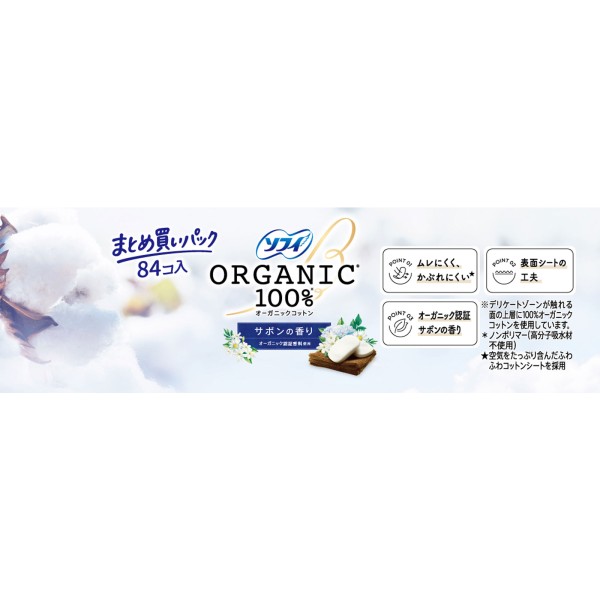 オーガニックコットンを使用したおりものシートサボンの香り84枚大容量パック。デリケートゾーンが触れる面の上層にオーガニックコットン100%を使用。オーガニック原料使用香料を使ったやさしいサボンの香り付き。全面通気性バックシートとふわふわコットンシートを採用しているから、ムレにくく、かぶれにくい。なみなみ形状の表面シートを採用し、おりものが肌に触れにくいから、ずっとサラサラをキープし快適なつけ心地