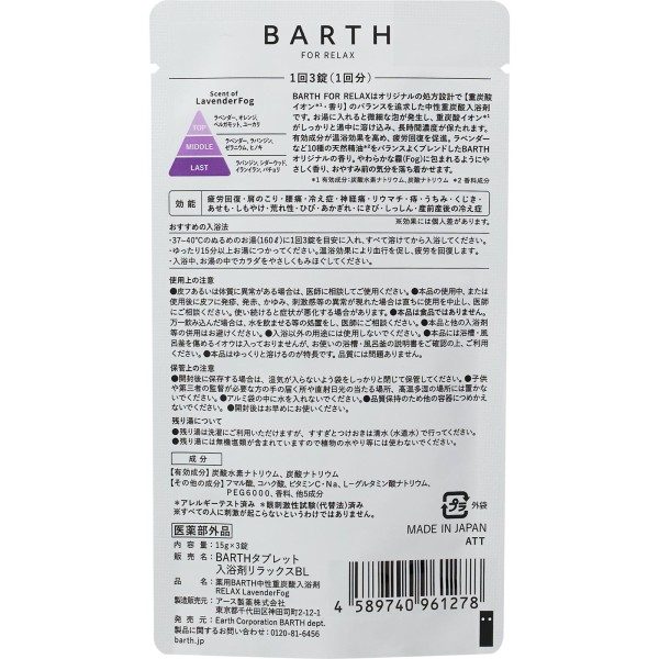 약용 BARTH 중성 탄산 입욕제 RELAX Lavender Fog 3정 BARTH > 고기능 기타