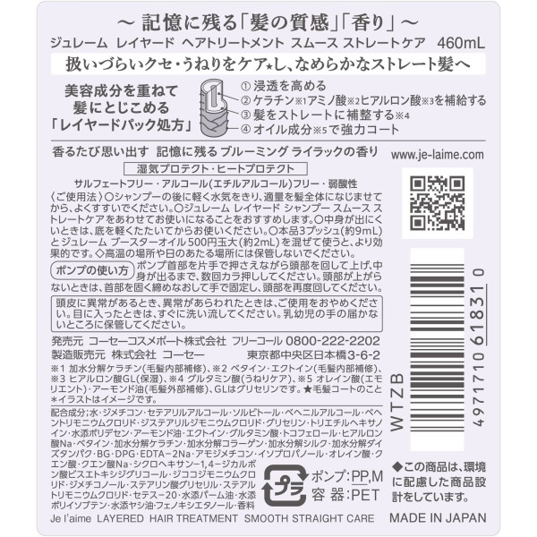 美容成分を重ねてとじこめるレイヤードパック処方で、記憶に残る「髪の質感」・「香り」を叶えるヘアトリートメント。扱いづらいクセ・うねりをケアし、なめらかなストレート髪へみちびくスムースストレートケアタイプ。香るたび思い出す、ブルーミングライラックの香り。