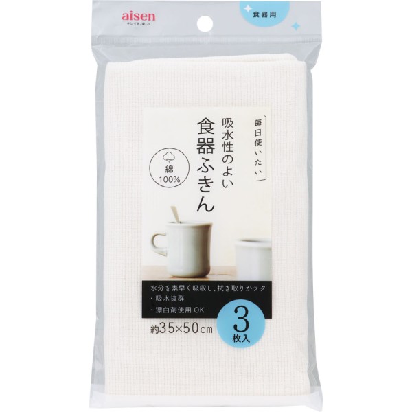 吸水性にすぐれた綿100%の食器用ふきん。水分を素早く吸収するのでラクに拭き取りができます。