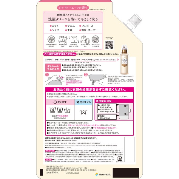 라본 샤레봉 오샤레 세탁세제 샤이니문 향 교체 2배사이즈 800ml 네이처랩 > 섬세의류용