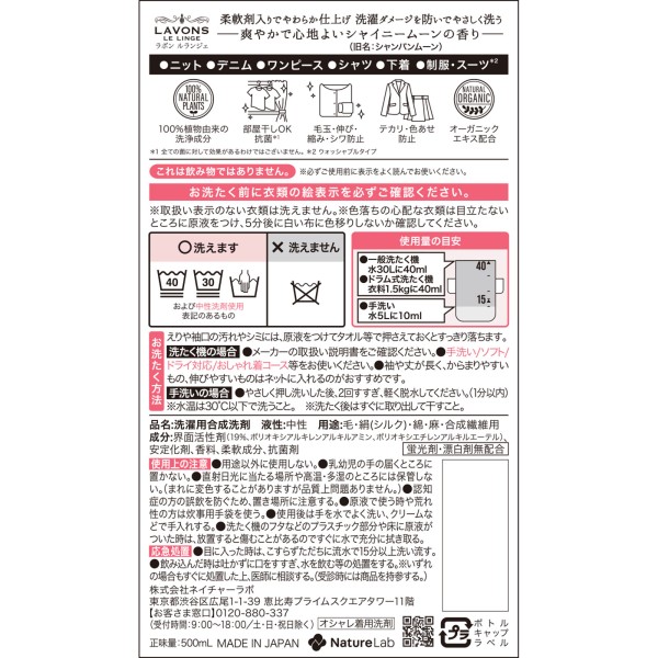 라본 샤레봉 오샤레 세탁세제 샤이니문 향 500ml 네이처랩 > 섬세의류용