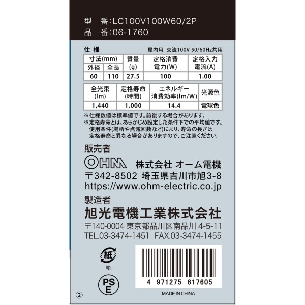 OHM 클리어전구 100W형 2P LC100V95W2PA 옴전기 > 백열전구