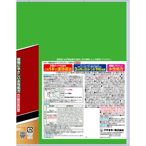 イヤな虫を速効退治/長期間住みつかせない/植物にやさしい水性処方/便利な2WAYノズルクモやアリ、ムカデなどのはう虫から、ガやカメムシなどの飛ぶ虫まで200種以上※の害虫に速効殺虫成分の働きですばやく退治します(※適用害虫表詳細参照)/クモ、アリ、ムカデ、ダンゴムシが住みつきそうな場所にあらかじめスプレーしておけば、住みつきを3ヵ月※予防できます(※雨がかからない条件で使用方法通り処理した場合。期間は使用環境により異なります)/植物の葉にかかっても薬害が出にくい水性処方なので安心。芝生でも使えます/ジェット噴射とワイド噴射の2WAYノズルで、近くの虫も高所の虫も楽に駆除できます●はう虫も飛ぶ虫も、お庭のイヤな虫をこれ1本で速効退治。クモやアリ、ムカデなどのはう虫から、ガやカメムシなどの飛ぶ虫まで200種以上※1の害虫に効果を発揮。速効殺虫成分の働きで、お庭のイヤな虫をすばやく退治します。(※1適用害虫の詳細は、適用害虫表をご確認ください)
