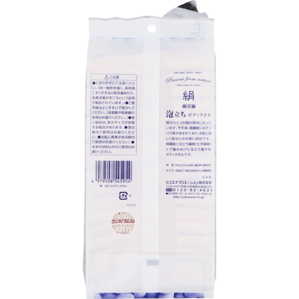 ○なめらかな肌触りが特徴のシルクで編み上げました。泡立ち豊かな天然ボディタオルです。