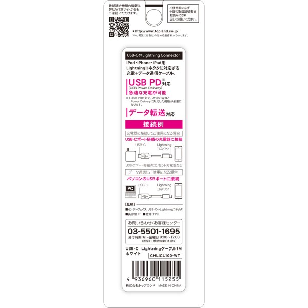 トップランドパワーデリバリーUSBタイプCライトニングケーブル1Mは、急速充電規格パワーデリバリ