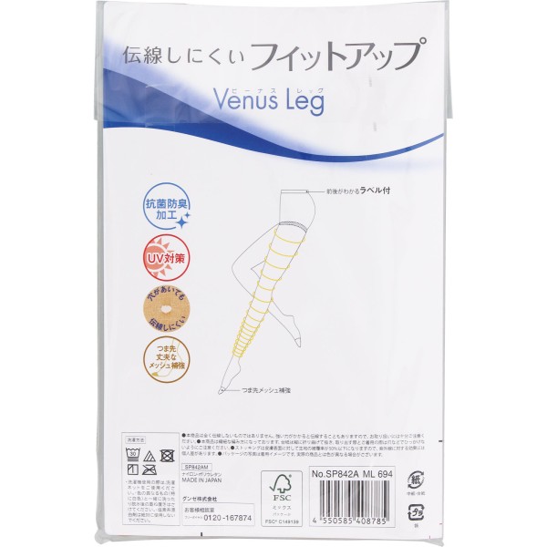 伝線しにくいフィットアップ2足組、つま先補強(丈夫なメッシュ仕様)、UV対策、抗菌防臭加工