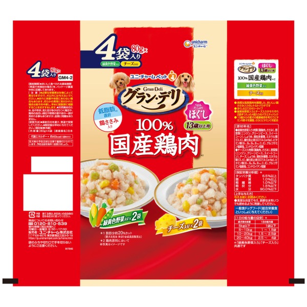 그란데리 국산닭가슴살 파우치 결 13세이상용 버라이어티(녹황색채소입, 치즈입) 80g×4P 유니참펫케어 > 레토르트 (하이시니어견용)