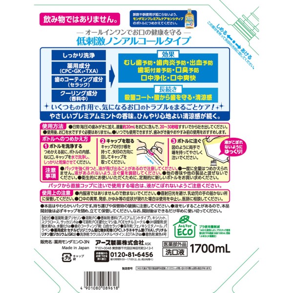 몬다민 프리미엄 케어 센시티브 대용량 파우치 구강 세정제 리필용 1700ml 아스제약 > 구취 예방