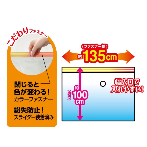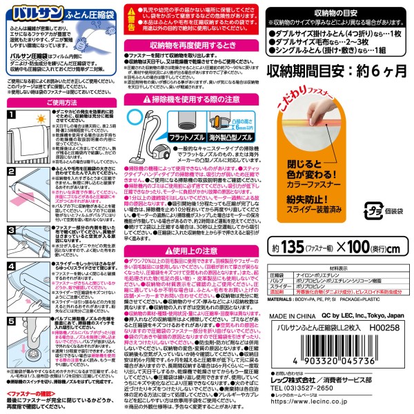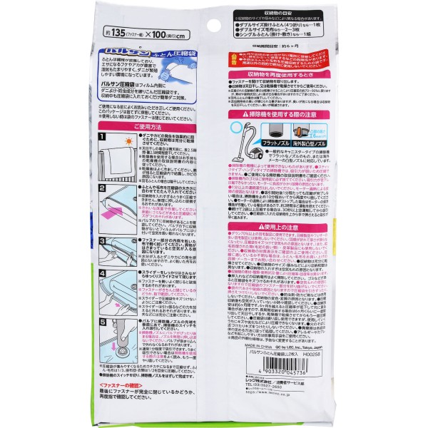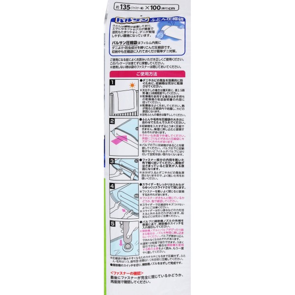 防虫・殺虫でおなじみ「効き目のバルサン」シリーズから圧縮袋が登場。ダニよけ成分に加えて防虫成分も配合。ダニだけではなく、イガ・カツオブシムシなどの害虫からも布団を守ります。アレルギーの原因ともなるダニはもちろん、大切な布団の繊維を食べてしまう害虫にも効果があります。ダニよけ・防虫成分は圧縮袋の内側に練り込んでいるので、外に漏れず内側だけに徐々に蒸散していきます。海外製凸型ノズルにも対応したオートバルブで、スピード吸引を実現しています。閉じると色が変わるカラーファスナーを採用。閉じ忘れを防ぎます。ファスナーを閉めるスライダーは取り付け済みなので、紛失もしづらいです。 ※収納物の目安、ダブルサイズ掛け布団なら4つ折りで1枚、ダブルサイズ毛布なら2~3枚、シングル布団(掛け敷きセット)なら1組
