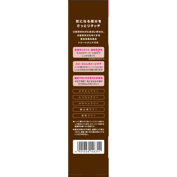 直塗ブラシ/生え際・分け目/ヘンナ葉/ミクロカラーコート処方直塗ブラシで手が汚れない/生え際・分け目も1度で根元までしっかり/三宝独自のテンスターヘンナ葉エキス配合/ミクロカラーコート処方配合で髪と頭皮にやさしいミクロサイズのHC色素が白髪の内部に定着し、色合いを与えます