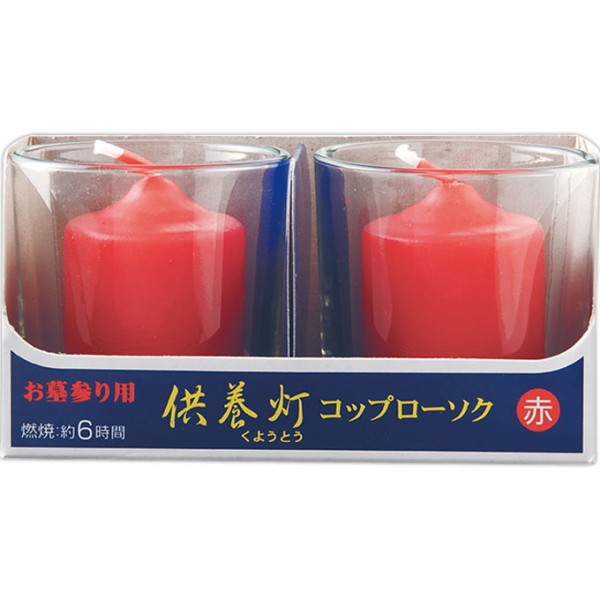 「供養灯コップローソク赤2個入」は、風が吹いても消えにくく、倒れにくい、お墓参りの際に便利なコップ入ローソクです。燃焼時間約6時間のローソクで2個入りです。○本体寸法φ55×H56(mm)○平均燃焼時間:約6時間