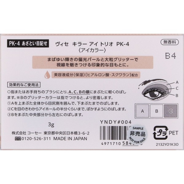 〇角度によって色が変わる高輝度偏光パールを多量配合。動くたび輝きが変化する高密着な3色入りセットアイカラー。