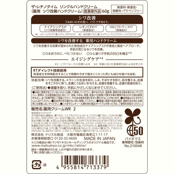 ●シワを改善する効果が認められた有効成分ナイアシンアミドが表皮と真皮へアプローチ。手肌の気になるシワを改善。
