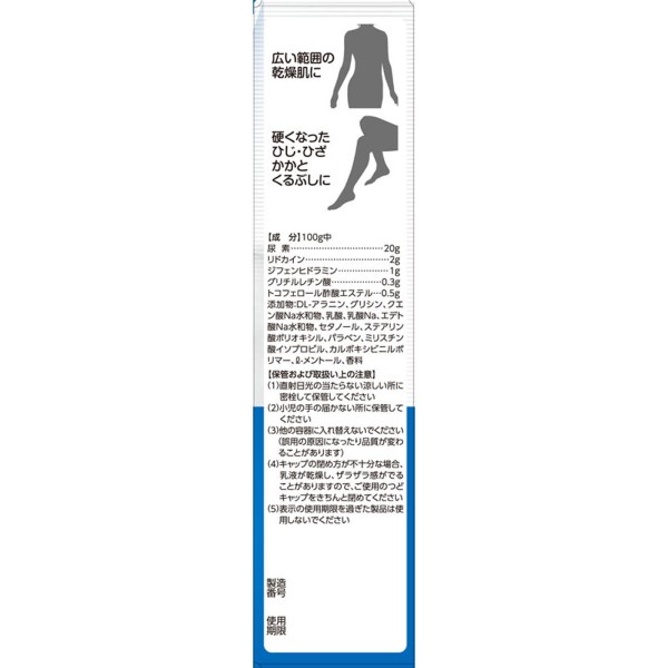 尿素の作用により角質層内の水分を調節し、乾燥による手あれ、ひざ・かかとなどの角化やザラザラした皮ふの状態を改善するとともに、ジフェンヒドラミン、リドカインの作用により皮ふの乾燥によるかゆみを抑えます。