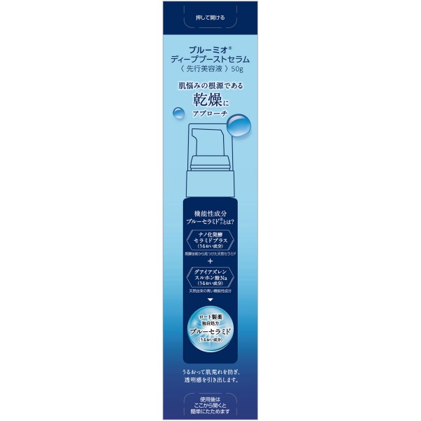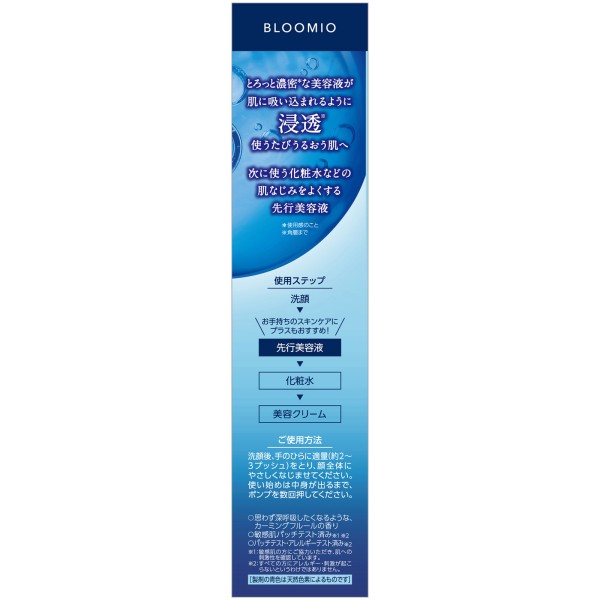 とろっと濃密*な美容液が肌に吸い込まれるように浸透※ 洗顔後すぐに使用することで、次に使う化粧水などの肌なじみをよくする先行美容液。 「ブルーセラミドR(うるおい成分)*3」を最高濃度*4配合。思わず深呼吸したくなるような、カーミングフルールの香り。 *使用感のこと※角層まで*4ブルーミオ内において *3ジヒドロキシリグノセロイルフィトスフィンゴシン、セラミド6ツー、グアイアズレンスルホン酸Na(うるおい成分)