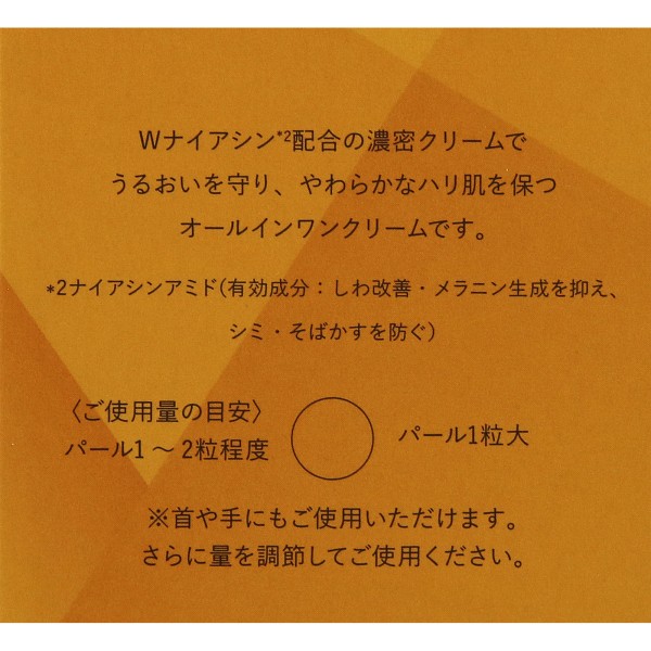 1品で6役(化粧水・保湿液・シワ改善美白※1美容液・クリーム・パック・ネッククリーム※2)を担い、大人世代が抱える複数の肌悩みにアプローチする“オールインワンクリーム”です。毎日のスキンケア工程の負担を軽減しながらも、本格的なエイジングケアを1ステップで叶え、「シンプルだけど物足りない」を感じさせない濃密クリームです。健康的で若々しい全体印象を叶えるために、Wナイアシン※3によるシワ改善、美白に加え、「コラーゲンコンプレックスSP※4」でハリ肌をサポート、大人世代が抱えるシミ・シワ・ハリ・ツヤ・乾燥などの複数の肌悩みにアプローチします。
