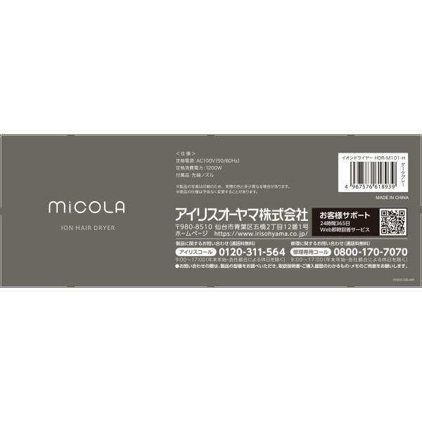 micola(미코라) 이온드라이어 다크그레이 HDR-M101-H 아이리스오야마 > 드라이어·컬 드라이어