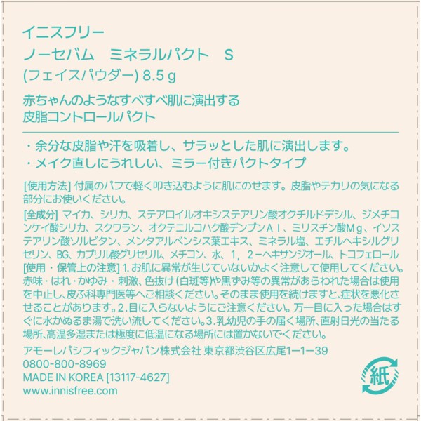 이니스프리 노세범 미네랄팩트 S 8.5g 아모레퍼시픽재팬 > 페이스 파우더